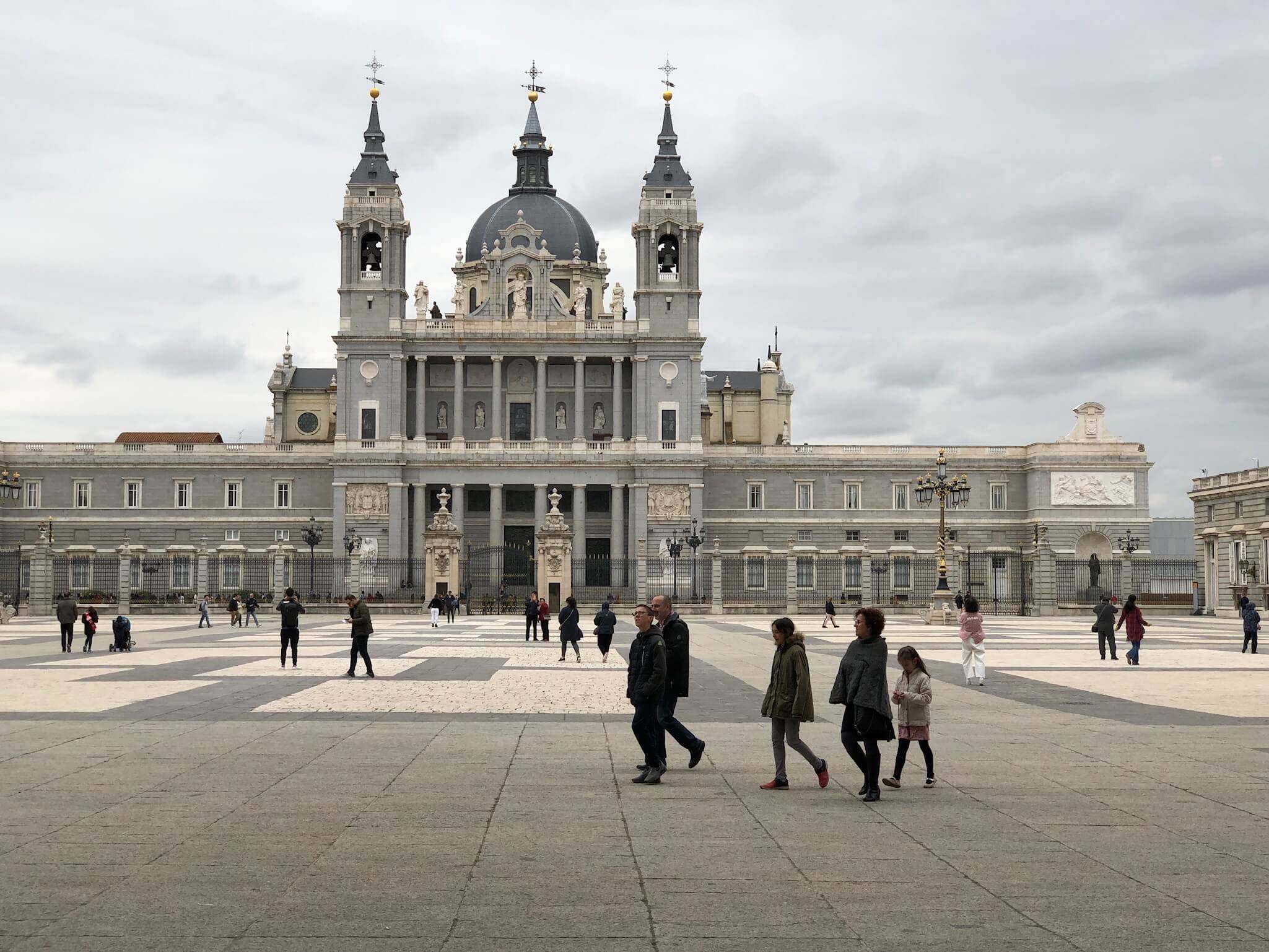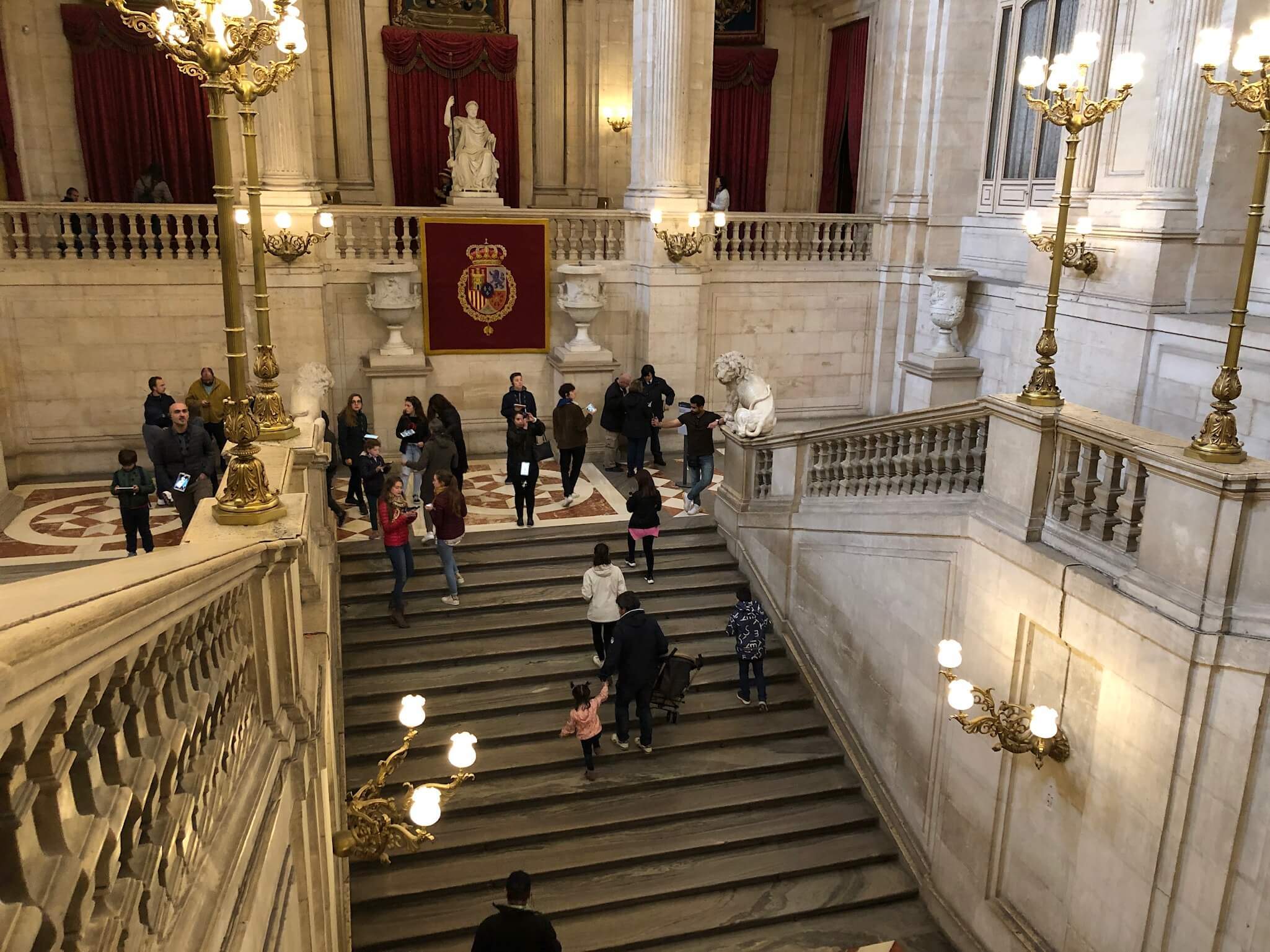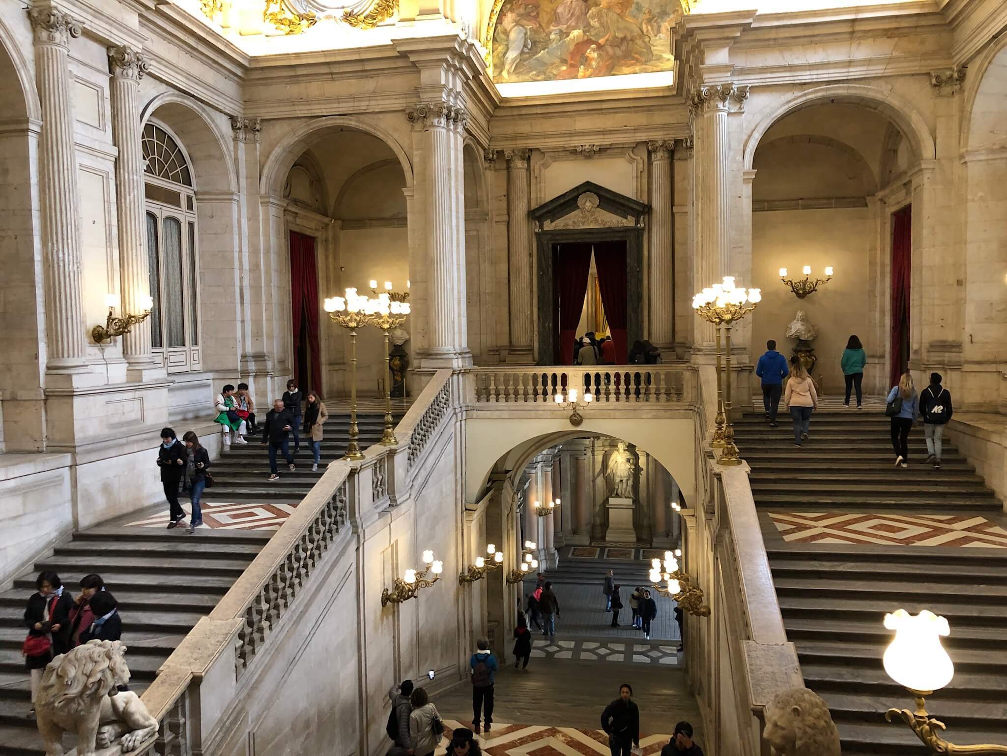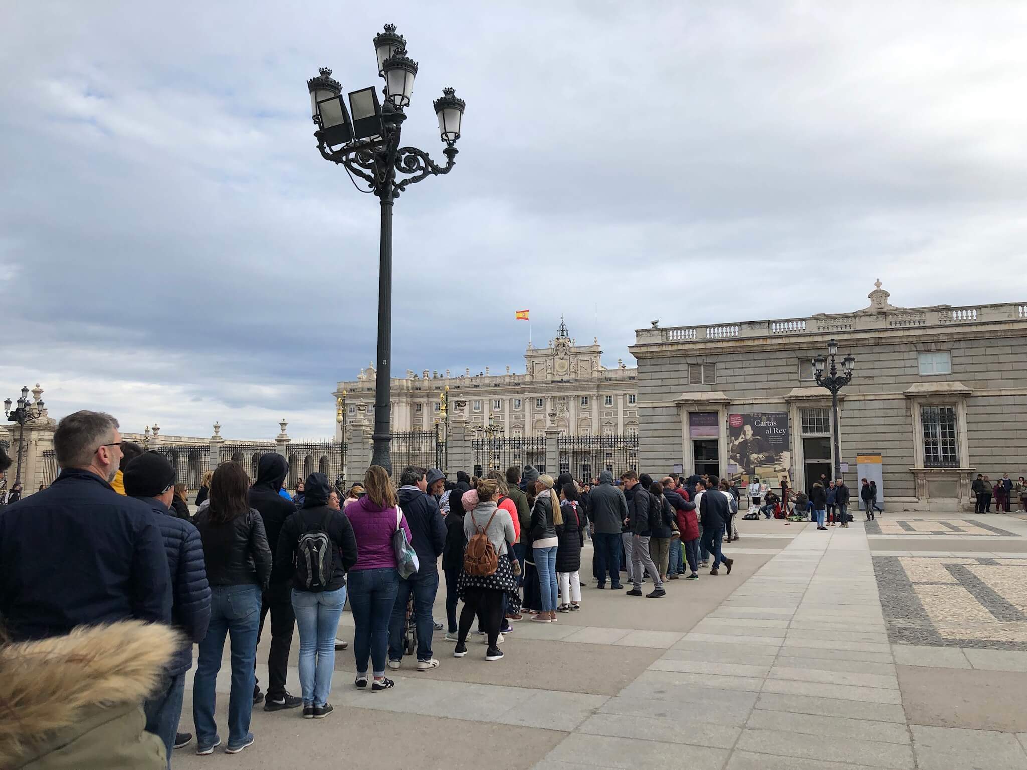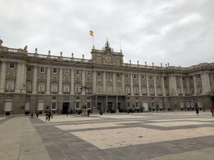 前回の「マドリッド市内観光」では長い行列に入場を諦めた「スペイン王宮」ですが今回は意を決して行列に並び入場して来ました。タイトル画像が入口に向かう列です。左端のドアが入口で左の列が予めチケットを入手した人たちの列、右の列がこれからチケットを買ういわゆるスタンバイの列です。入口の右側のドアは出口です。チケットの有無に関わらず、まず入口で保安検査があり、空港にあるような金属探知機で人の検査と手荷物はX線検査を受けます。ここまでの進捗はどちらの列も同じなので事前にチケットを購入する意味はあまりないかもしれませんが、夏休みなどで外国人が多く来場する時はスタンバイ列は入場制限があるのかもしれません。今回はイースター休暇でしたがそれほど列の進み具体は変わらない感じでした。手荷物検査の時にグループで来場して手荷物を複数持っていると「ロッカーに預けるように」と書かれたタグを付けられます。このタグを付けられた荷物は、チケットブースの奥にロッカーがあるのでそこに入れなければなりません。事前購入しないで来たのでチケットブースで大人13ユーロ(ガイドなしのベーシック)を購入して王宮前広場に出ます。4月としては寒い中列に並んだので建物の中に居たかったのですが王宮へは広場からアクセスするようです。