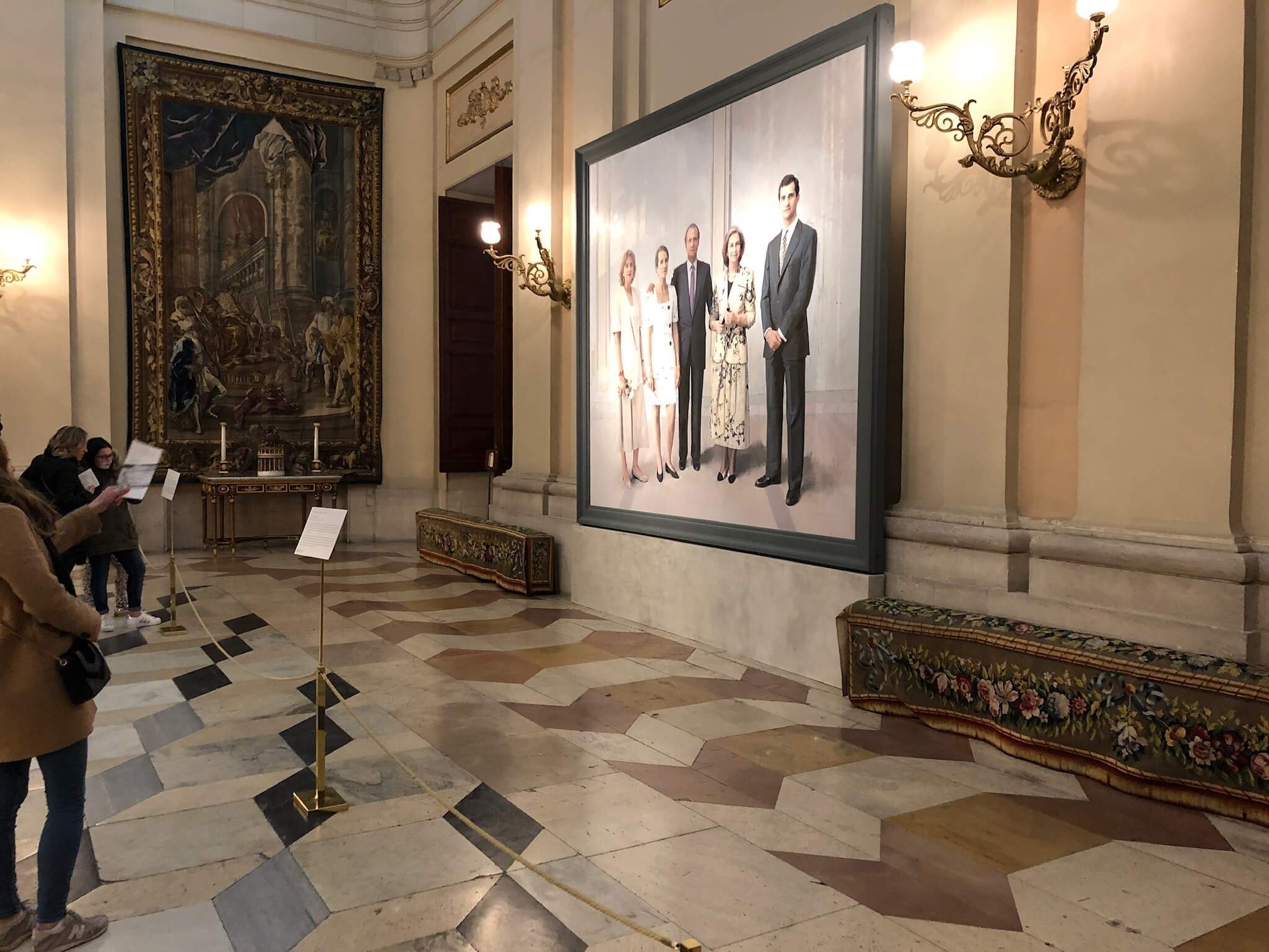 現在の国王一家の巨大な肖像画が飾られていました。この辺りまでは写真撮影可能ですが、ここから先の美術品などは撮影禁止でした。本物のゴヤ作品!他にもタペストリーとかドイツやフランスなどからの磁器など国宝級の品々が数多く展示されていました。