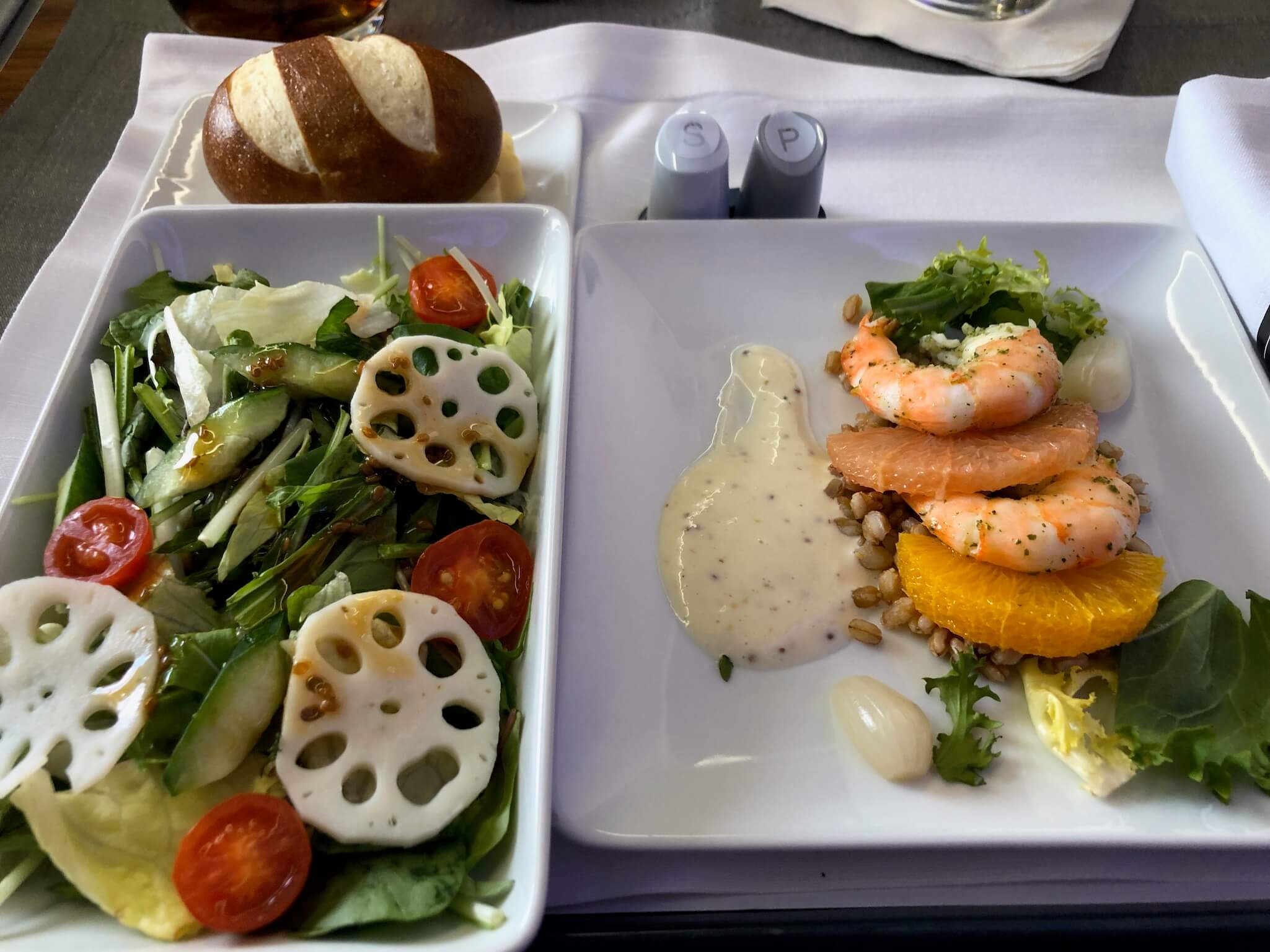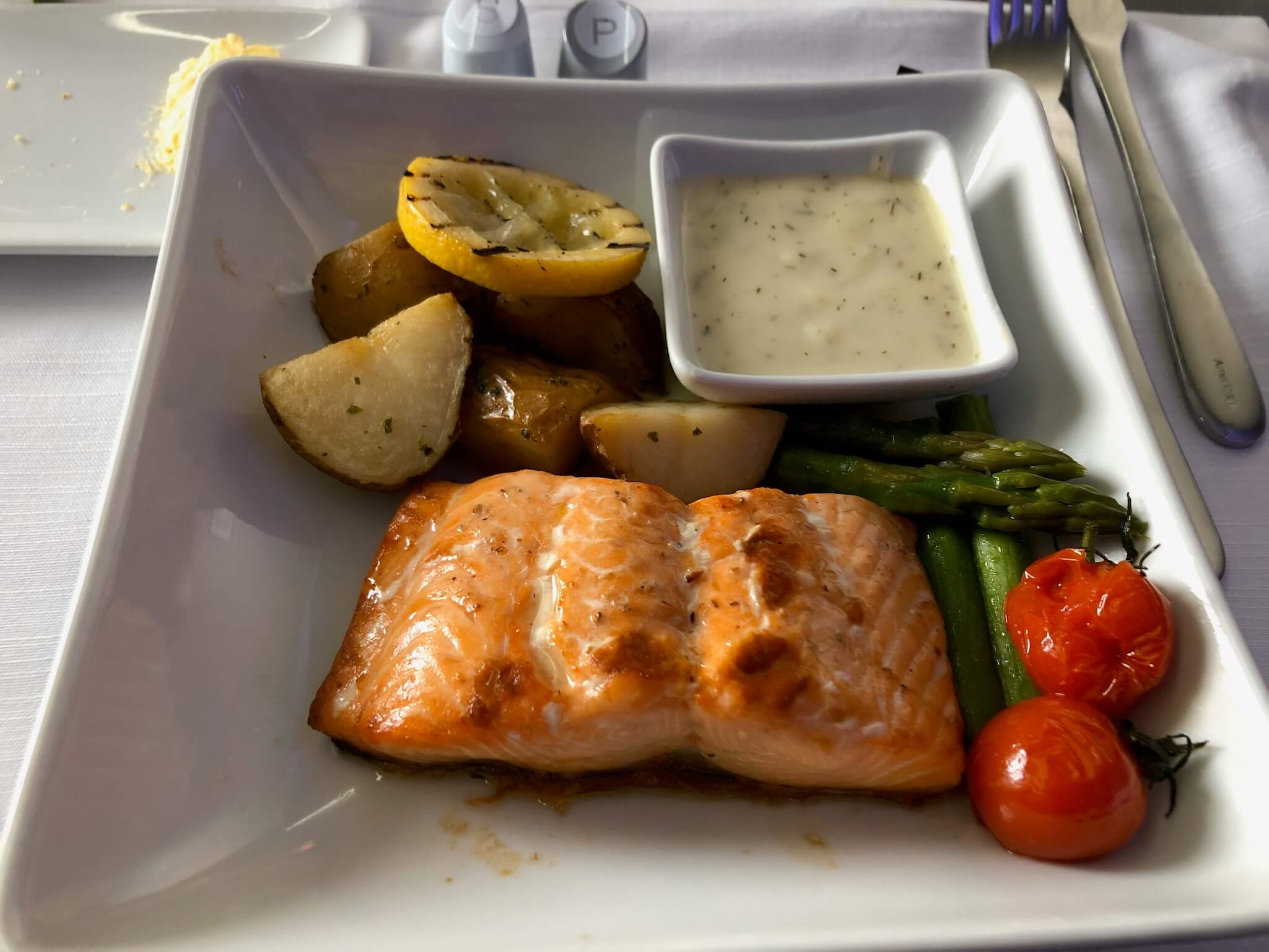 食事はそこそこボリュームもあり味も申し分ありません。日本航空提供の和食もあるとのことで頼んでみたら、売り切れでした(笑)。。。で、残っていたのが「Fish Only!」ですが、これが意外に正解でサーモンが滅茶苦茶美味しかったです。