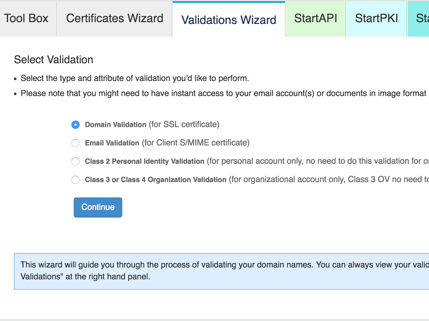 StartSSLのCertificationを入手するには、まず使用するパソコンに個人証明書を入れる必要がある。Validation WizardタブのEmail Validationを選ぶ。下の画像では、2番目のラジオボタンが該当する。