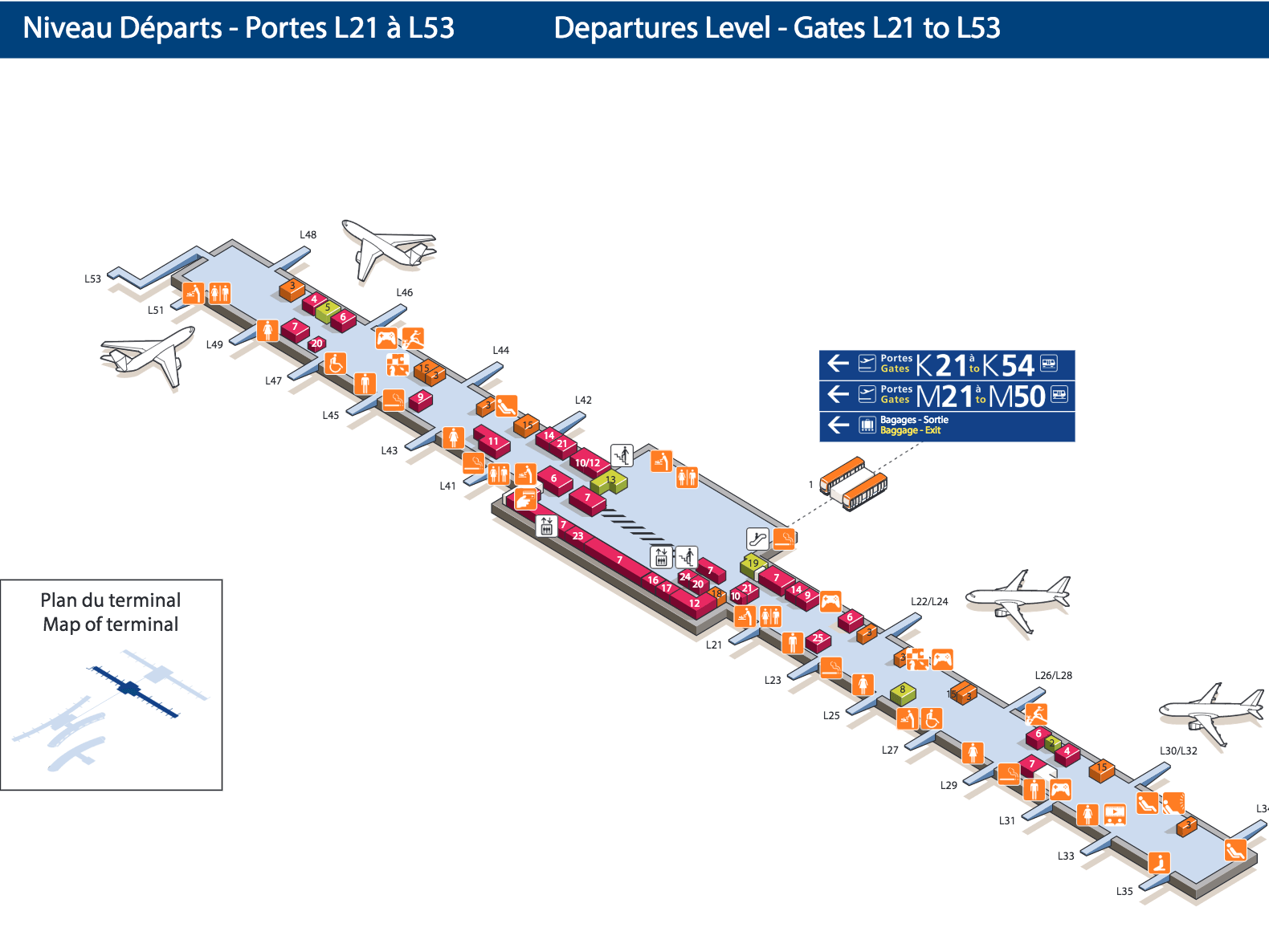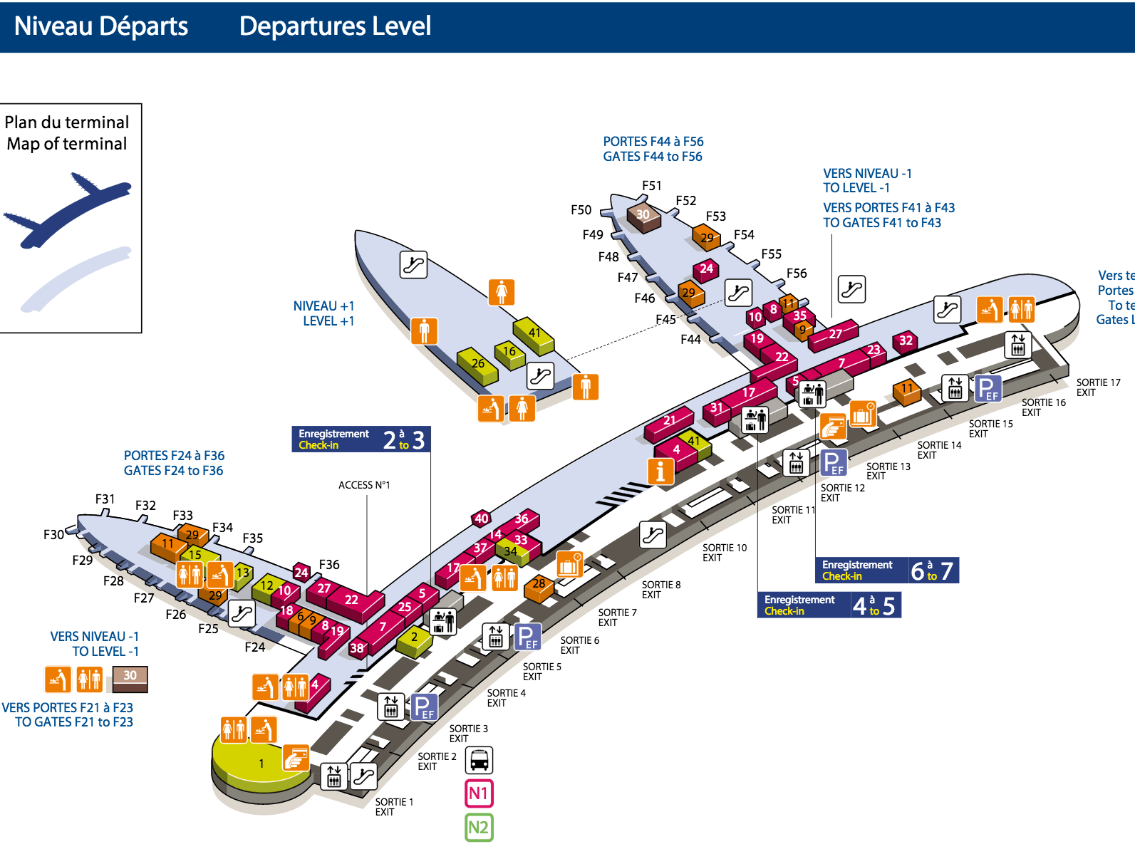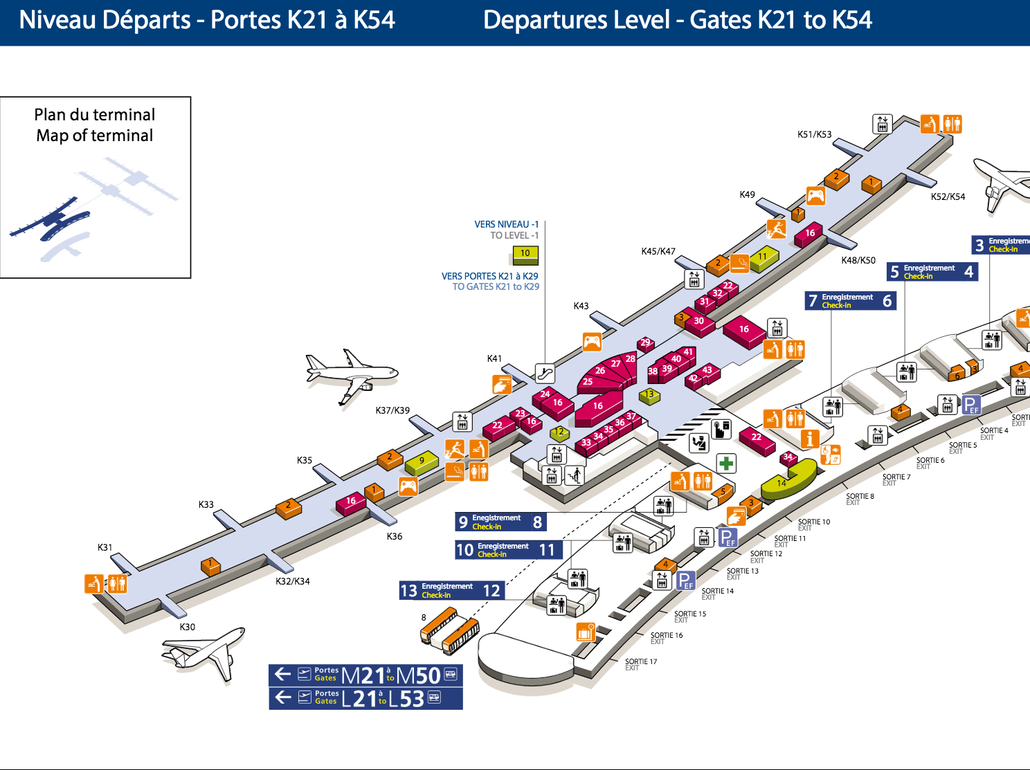 今回は往復ともパリ経由なので、シャルルドゴール空港の攻略法をおさらいしてみます。日本からのJAL便は、羽田発着便(JL45/46)はターミナル2EホールKに到着します。成田発着便(JL415/416)はターミナル2EホールLに到着します。