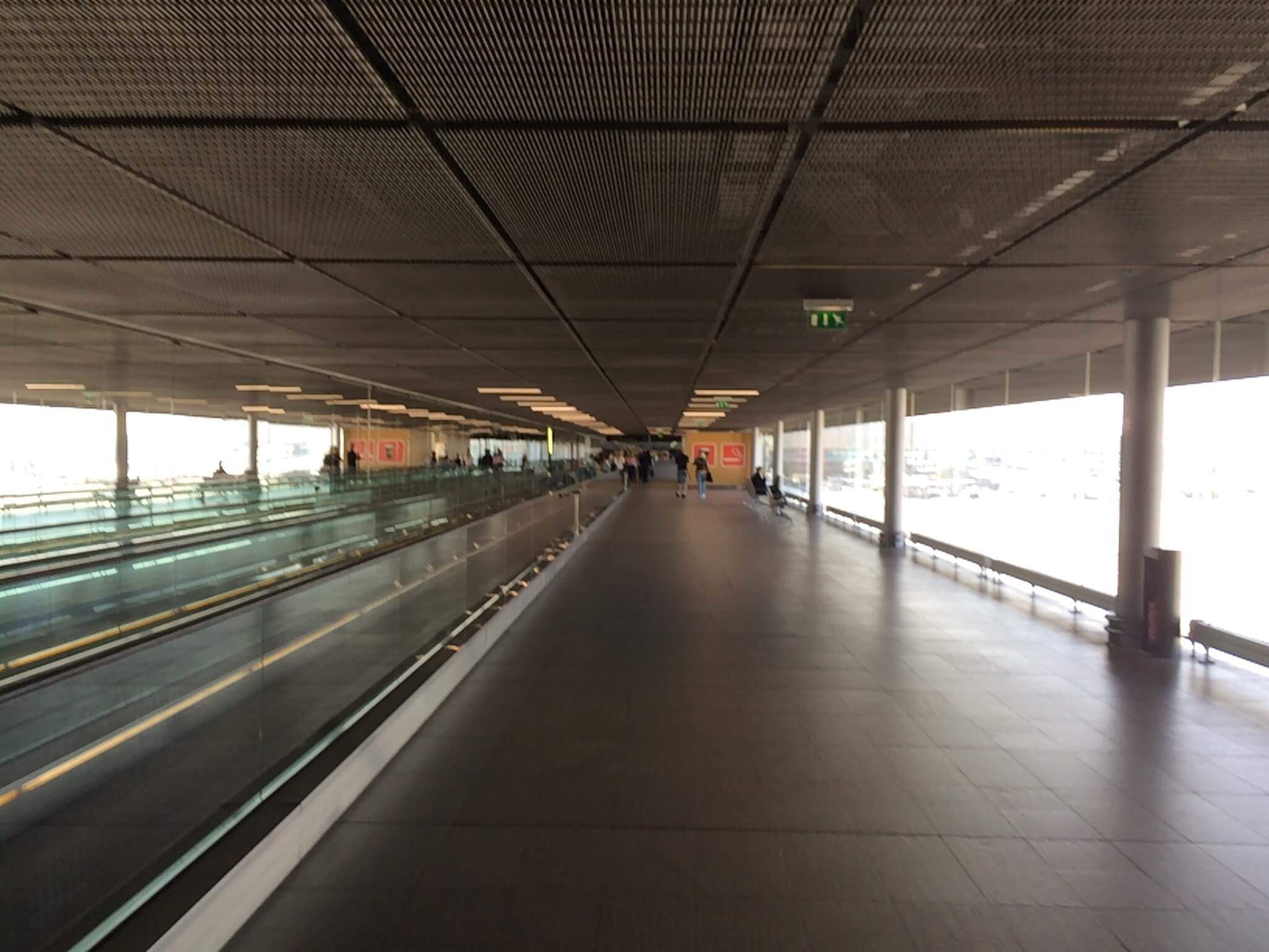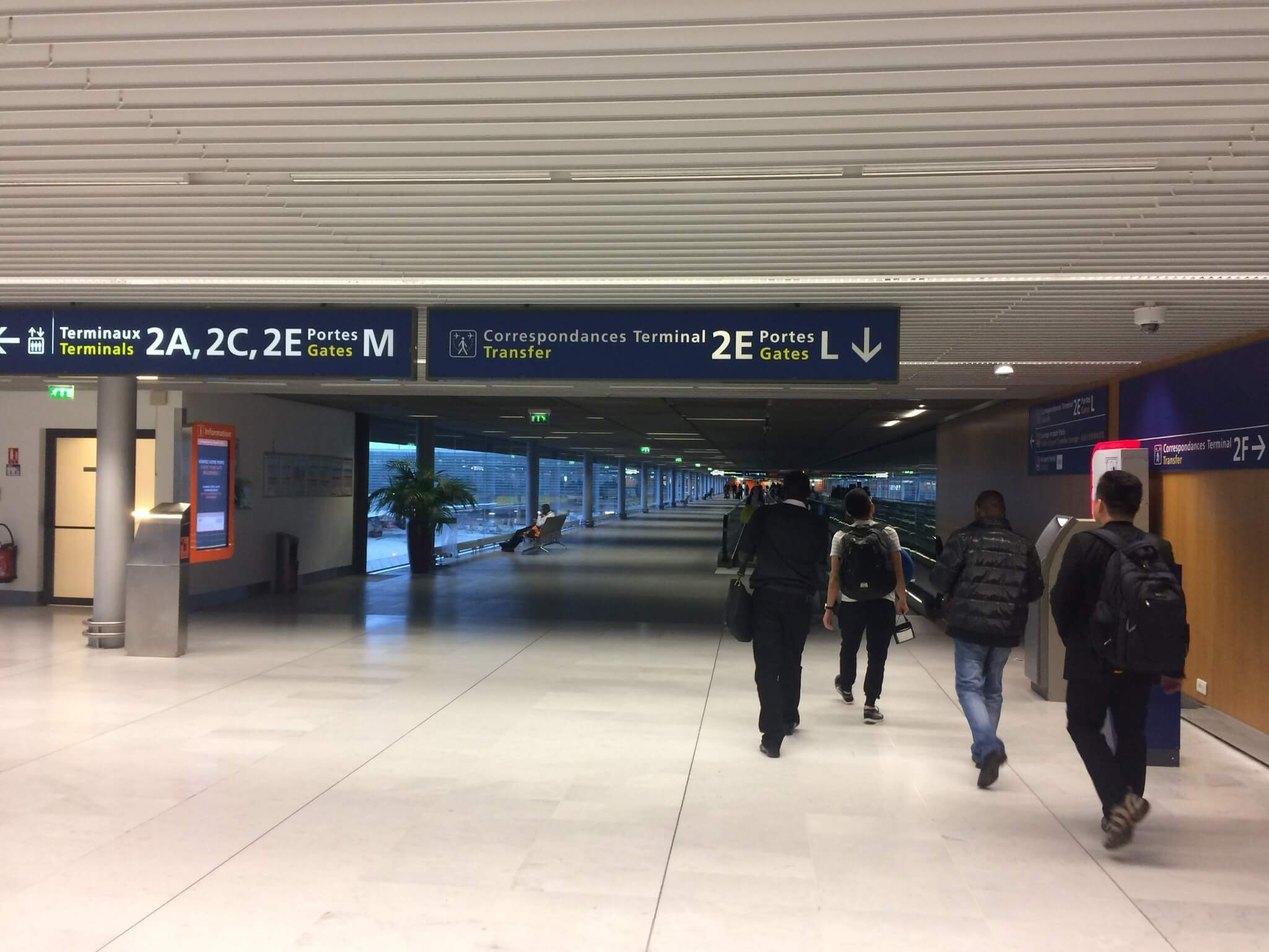 飛行機を降りたら、ターミナル2Fを目指して歩きます。パリからマドリッド行きのエールフランス便はターミナル2Fから出発します。途中にセキュリティチェックとイミグレーションがあります。ここでEUへ入域します。この写真はホールLからターミナル2Fへ向かって歩いているところです。