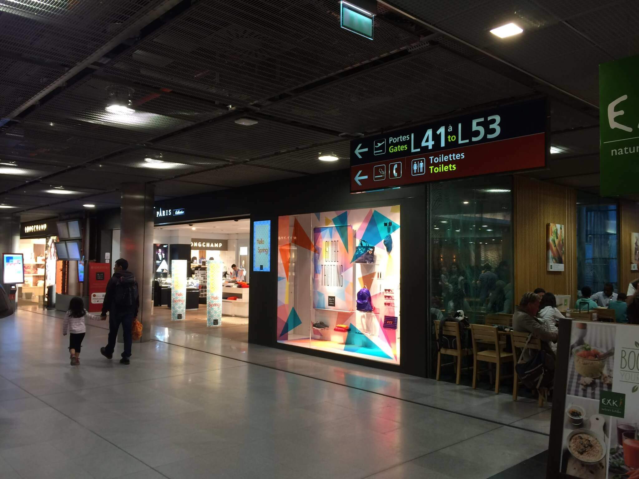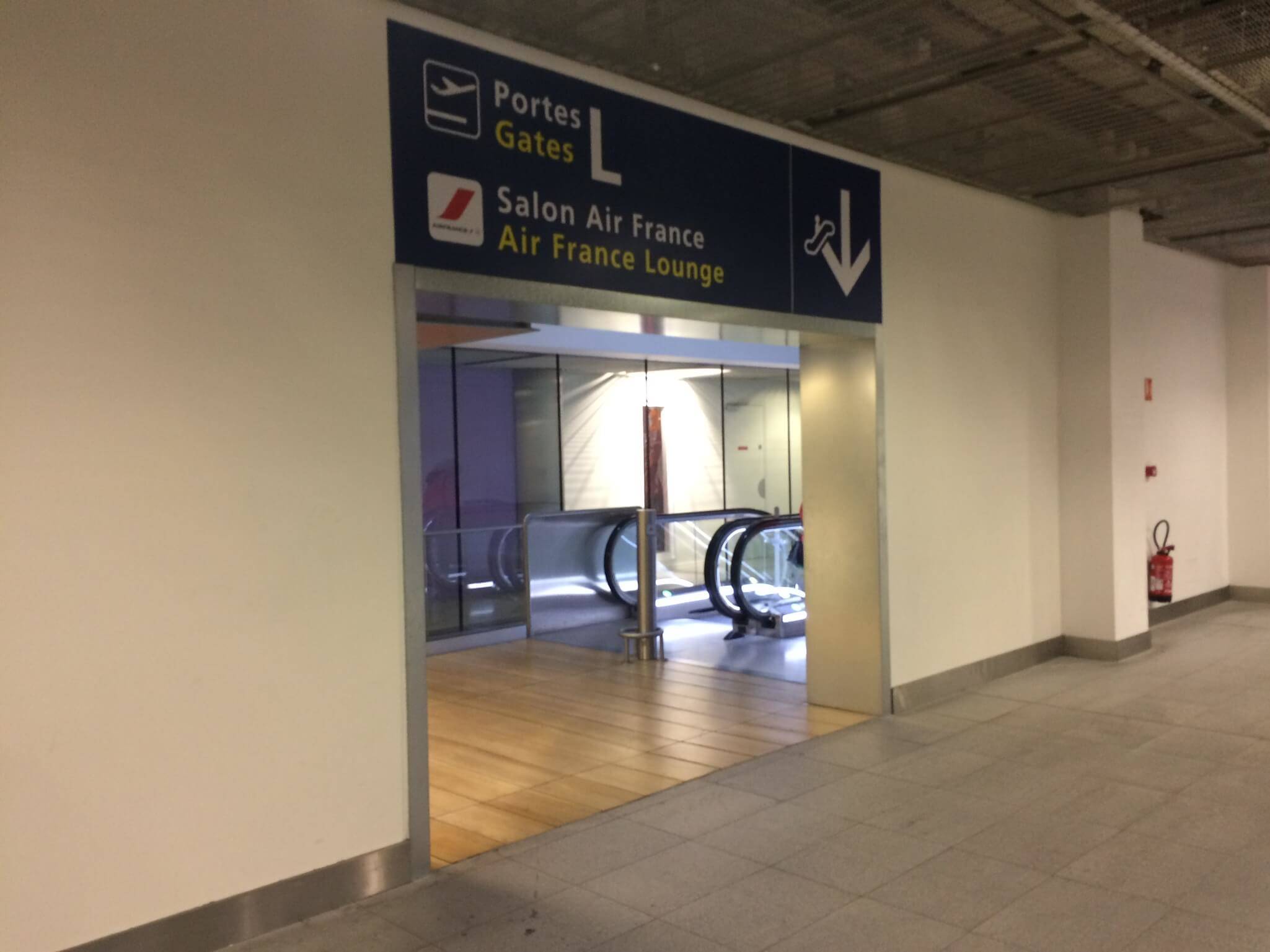 ホールLの搭乗ゲートへ降りるエスカレータ付近にエールフランスのラウンジ入口があるので、搭乗フロアで買物の予定がなければ、ここで下へ降りずに上のエールフランスラウンジへ向かいます。