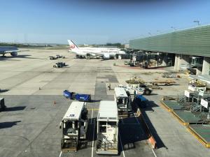 マドリッドからの到着はターミナル2Fでセキュリティチェックはありませんが、2Fと2Eの間にイミグレーションがあり、ここでEU域内から出国します。これはターミナル2Fの角の部分に到着した時の写真です。右手上に見えるのが出発階からの搭乗口です。上の写真の下から見上げている構図です。
