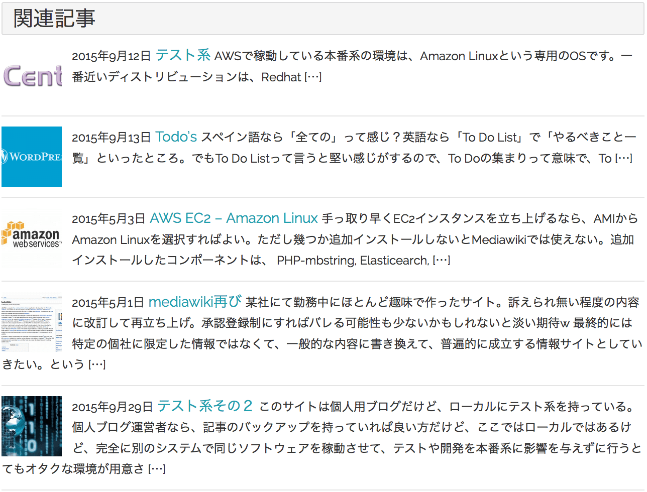 設定の中に、記事タイトルだけじゃなくて、サムネイルや抜粋を表示する選択が出来るので、それを選択した結果、表示されるようになったのが、これです。