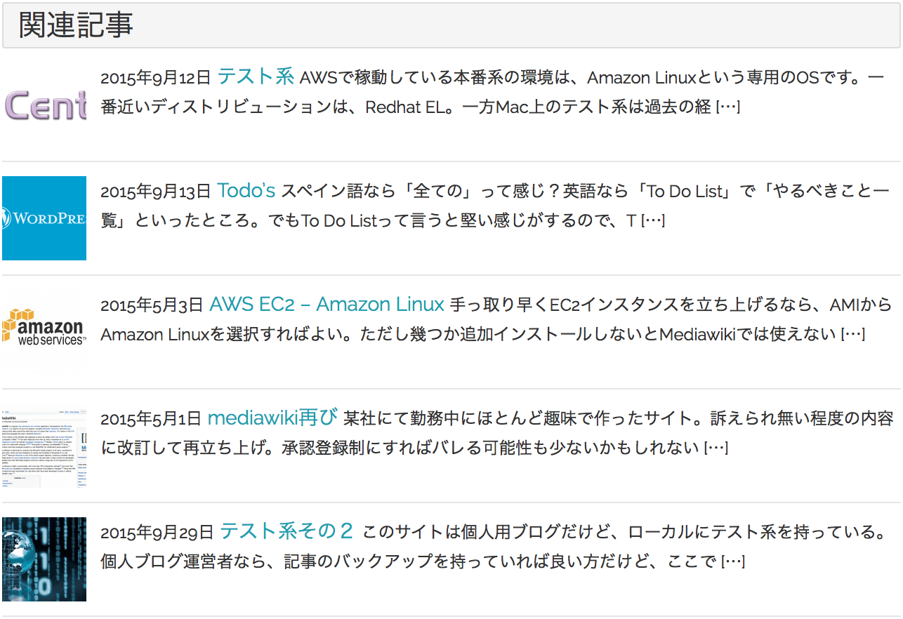アイキャッチ画像が設定されていると、それがサムネイル表示され、投稿日とタイトルの後に、指定した文字列の抜粋がつきます。いい感じです。