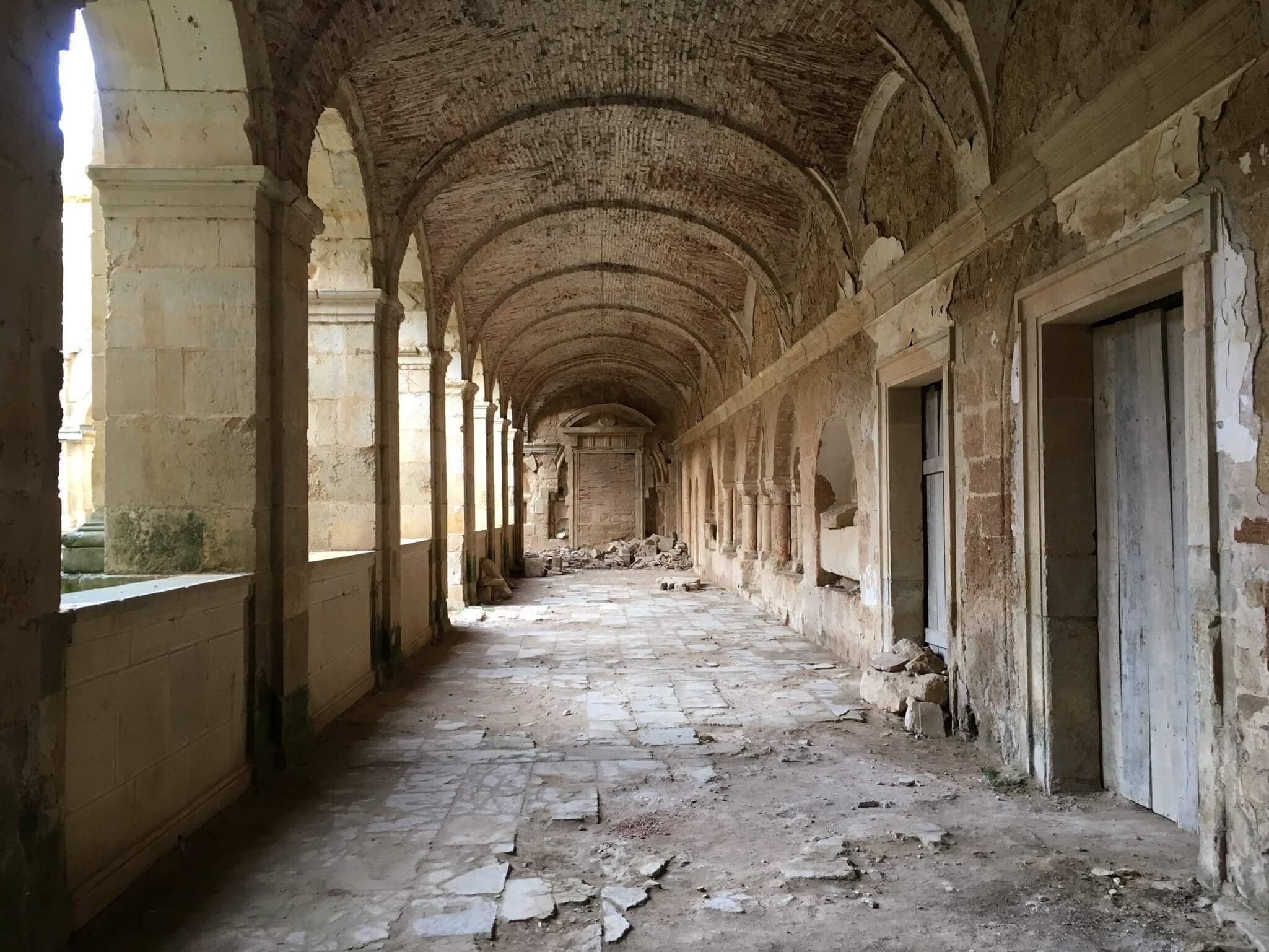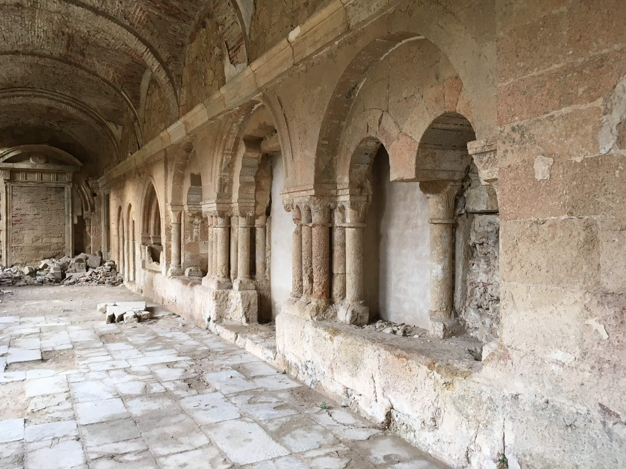 右側の建物が修道院跡です。現在は廃墟となっており地元自治体の努力により鋭意修復中です。予算がついた部分から修復されているようです。外見だけ見学する予定でしたが管理人の好意により内部も見学できることに。