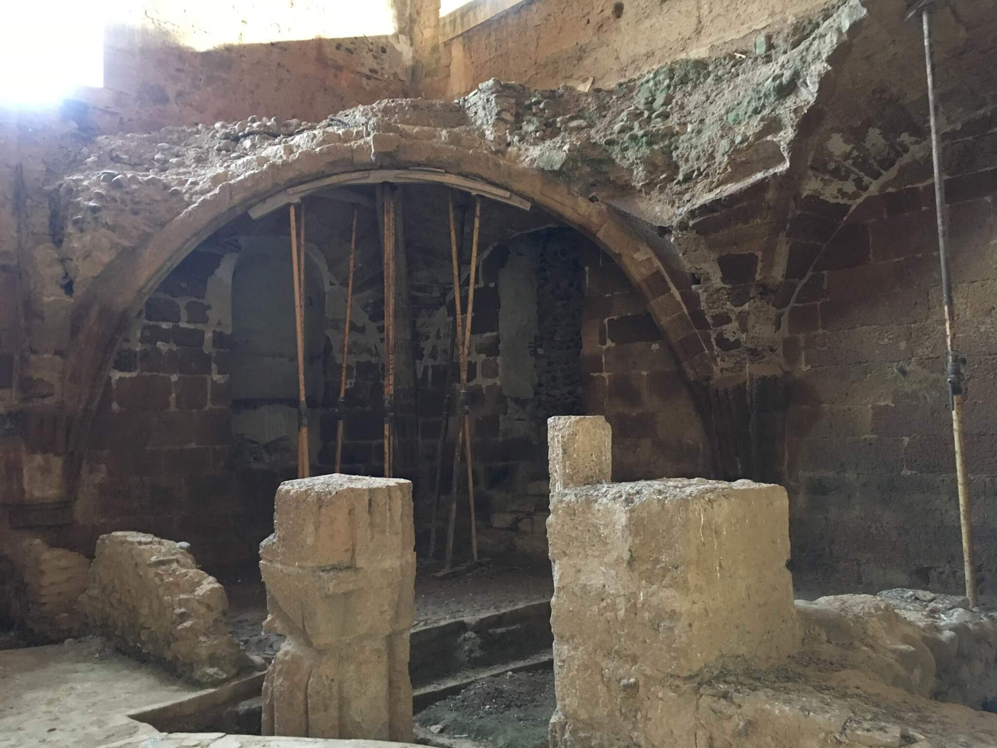 ローマ時代のアーチ建築が崩壊してしまったところです。そのまま残っていれば壮観だったと思います。増水した川からの水害を防ぐため何度も嵩上げ工事がされています。オリジナルと現在の床との段差が嵩上げ工事の回数を物語っています。