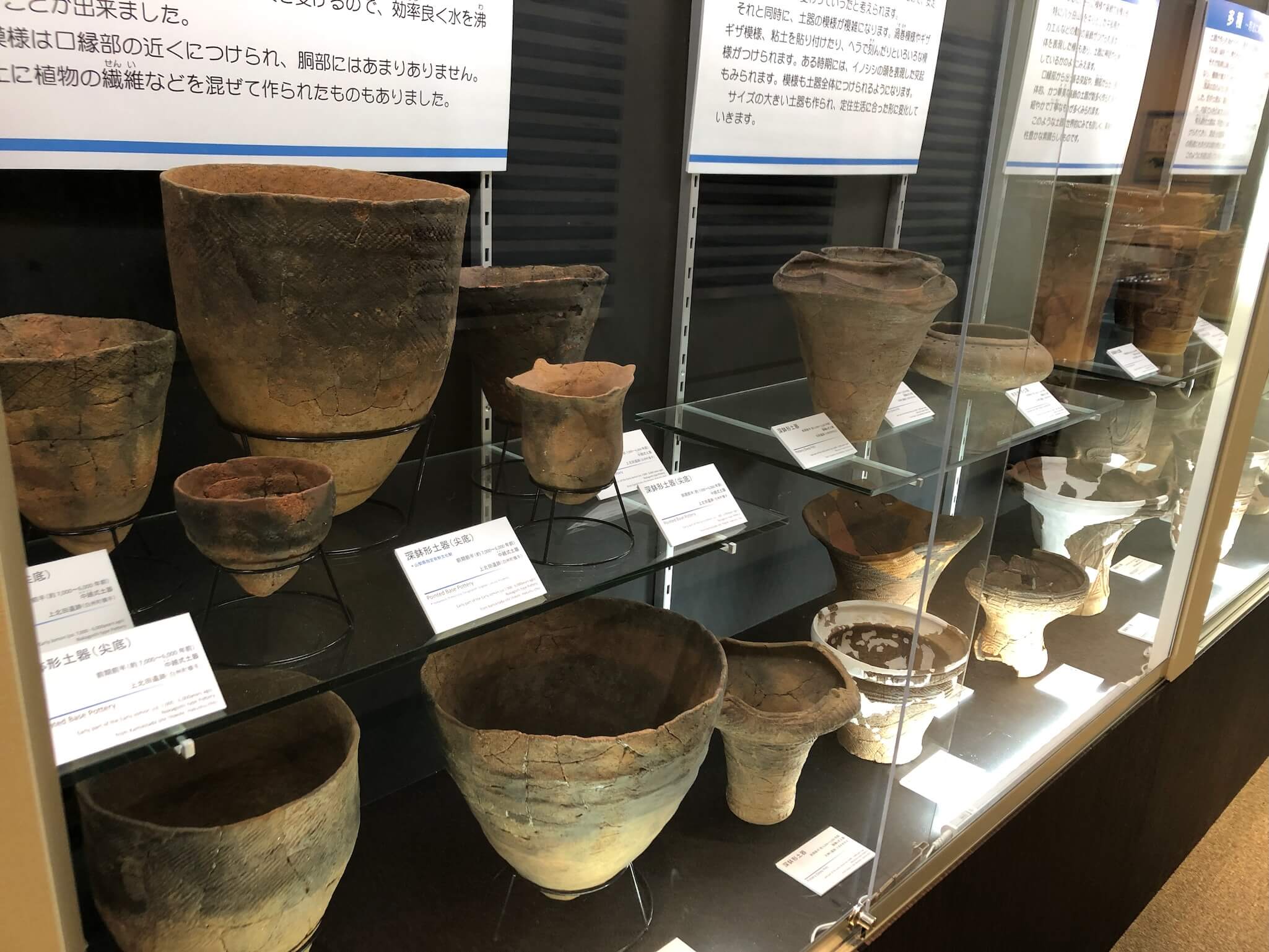 その他には、縄文前期前半に多かった尖底の深鉢形土器などが展示されている。シンプルな縄文が特徴のいわゆる縄文土器である。今日はこの後、ちゅうた君が出土した金生遺跡へ行ってみるつもりである。