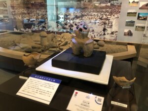 これは中空土偶と呼ばれる土偶で、遮光器土偶と同様に中が空洞になっている。この土偶はここから近い金生遺跡から出土した土偶である。この土偶のデザインもこれまでに見たことが無い形である。愛称は「ちゅうた君」だそうである。