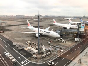 桃園空港のゲートからみたJALの787-8型機、直前予約のためアップグレード出来ないチケット種別のため往復ともエコノミークラス利用です。シートはタイトル画像の新間隔エコノミーなので他社のエコノミークラスよりは楽だし、そもそも飛行時間が欧州便に比べたら半分以下なのでなんとかなります。