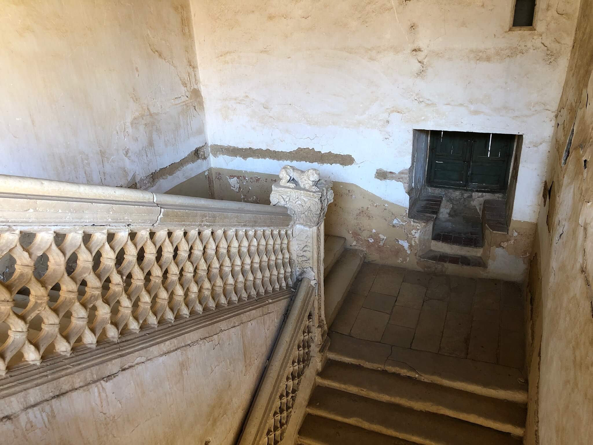 話を戻して、大きな扉から入った先は例によって回廊式です。右側の階段を使って上に上がります。この写真では上から写しています。2階も回廊となっていてタイトル画像がその写真です。