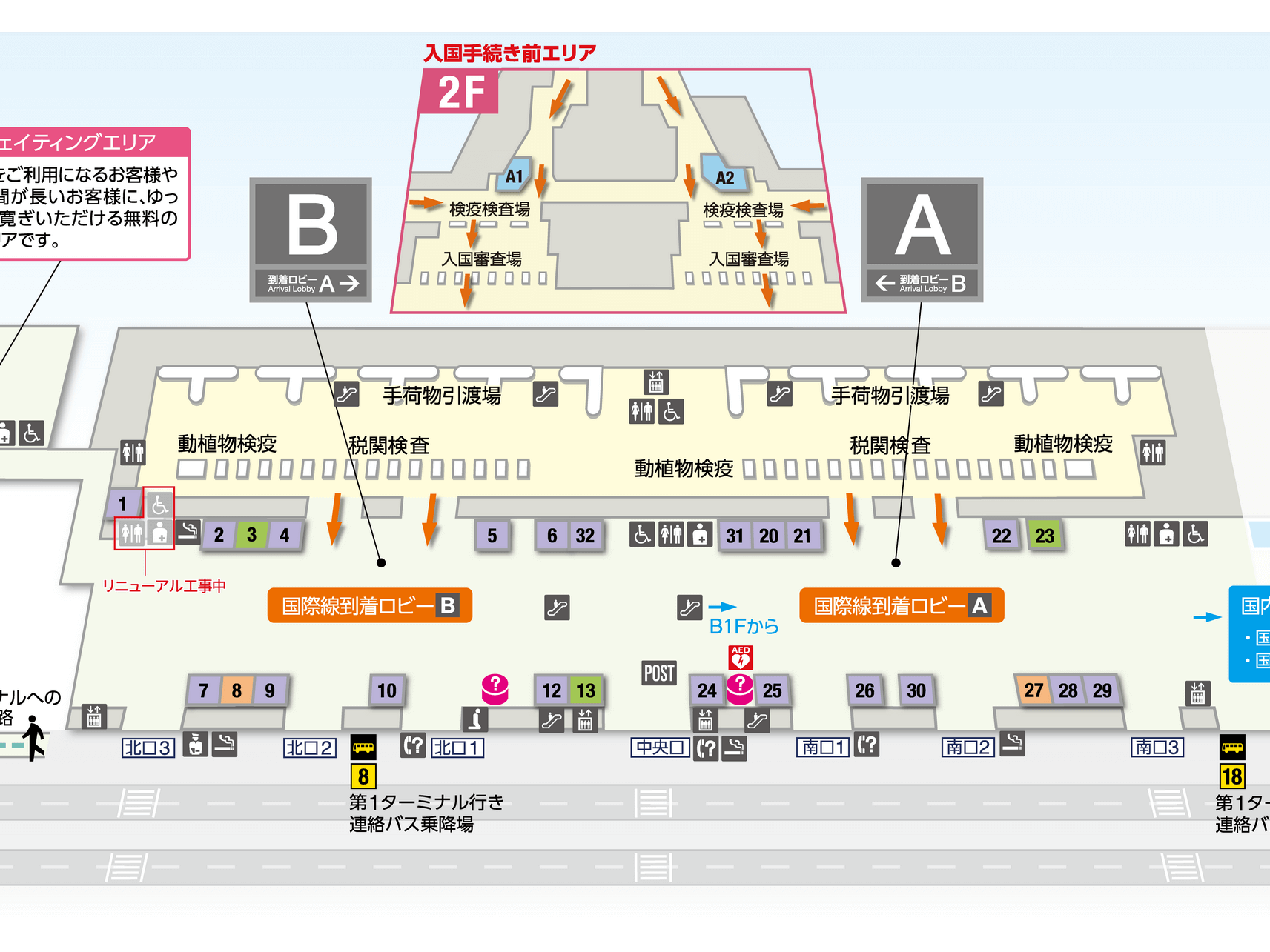 次は到着時です。本館到着でもサテライト到着でもフロア(2階)は同一です。