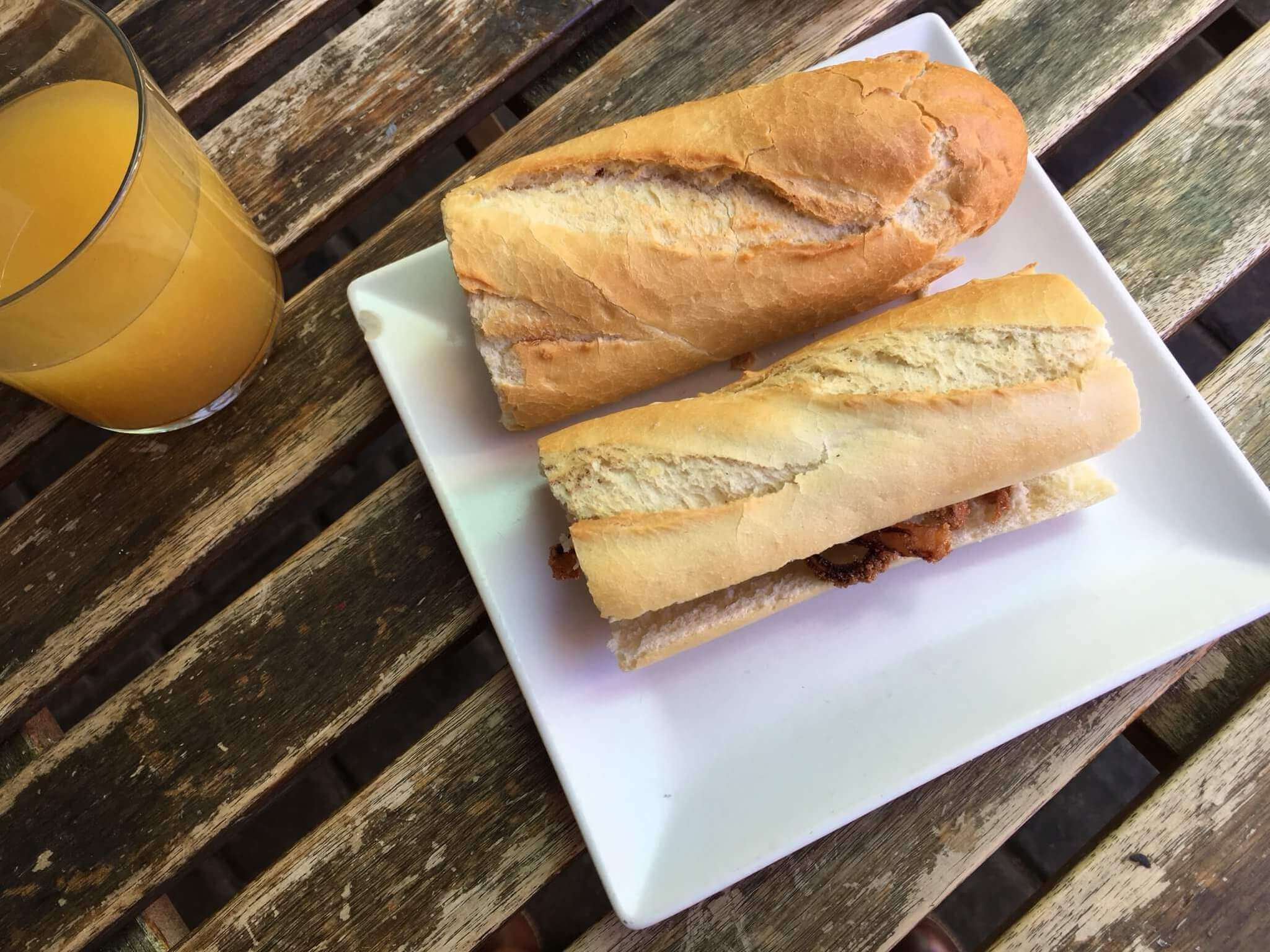 タパと思ったら朝食セットがあったのでそちらをチョイス。定番のイカフライのボカディージョ。朝食だからと決めつけのオレンジジュースとコーヒーのセットで2ユーロです。