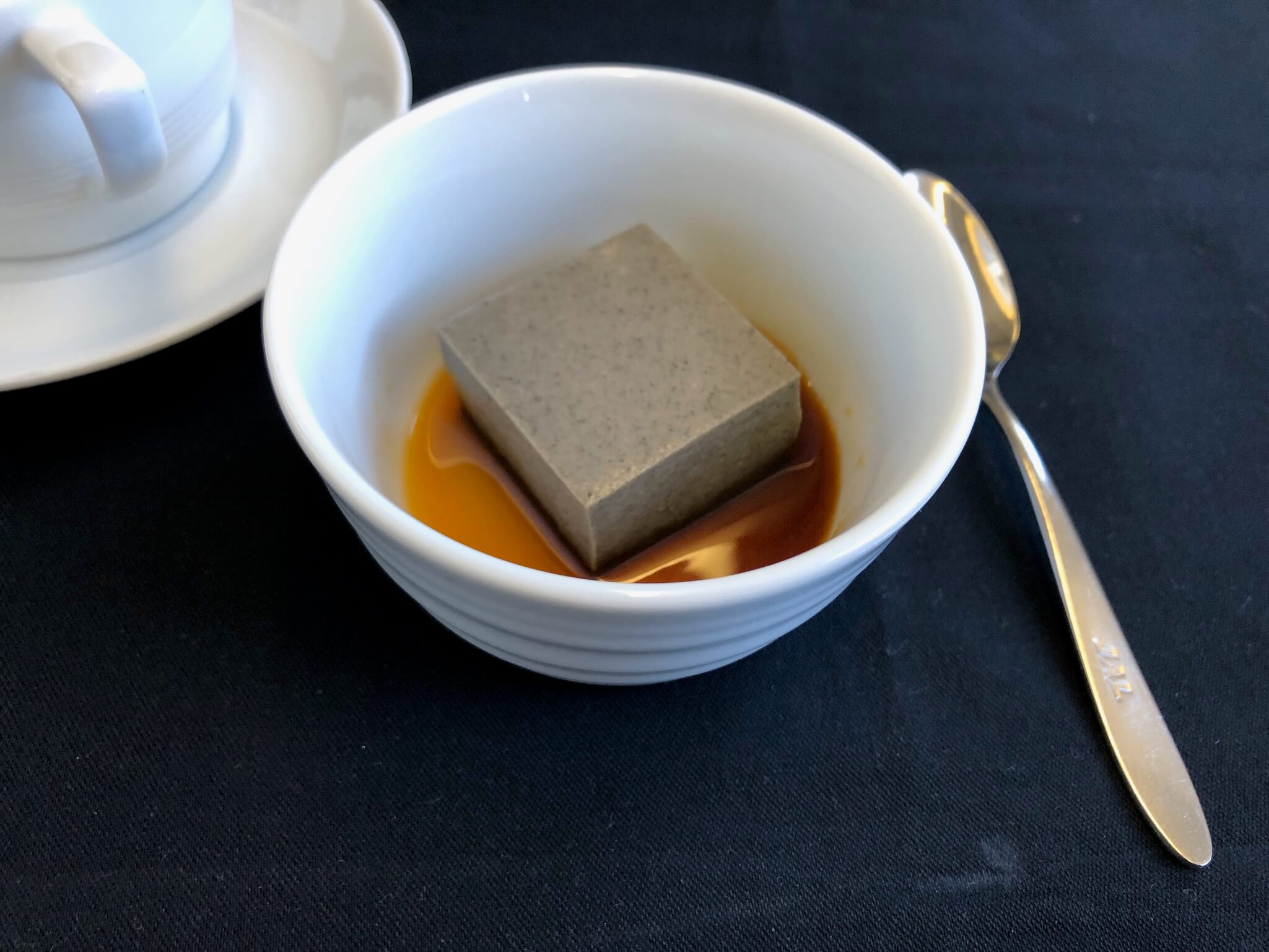 朝食も和食です。このご飯は国内線ファーストクラスでも見たことがあります。俵おにぎり(みたいなもの)が竹の子の皮を模した紙で包んであります。この方が効率がいいんだろうなって思います。