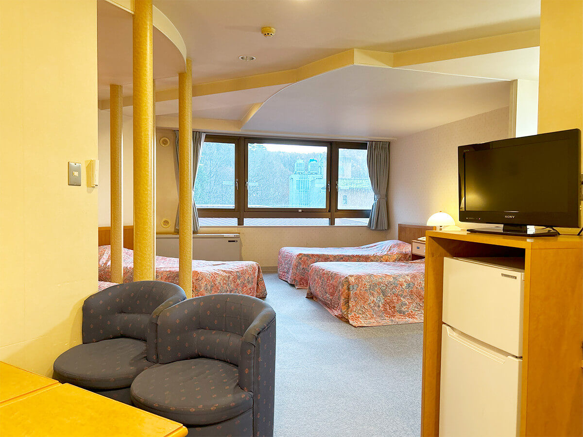 この日の部屋はフォースと呼ばれる一番リーズナブルな4人部屋の2人利用だった。広さは十分、部屋自体は経年劣化を感じさせるが、そのマイナスを補って余りあるお湯の良さがこのホテルの最大の特徴と言える。