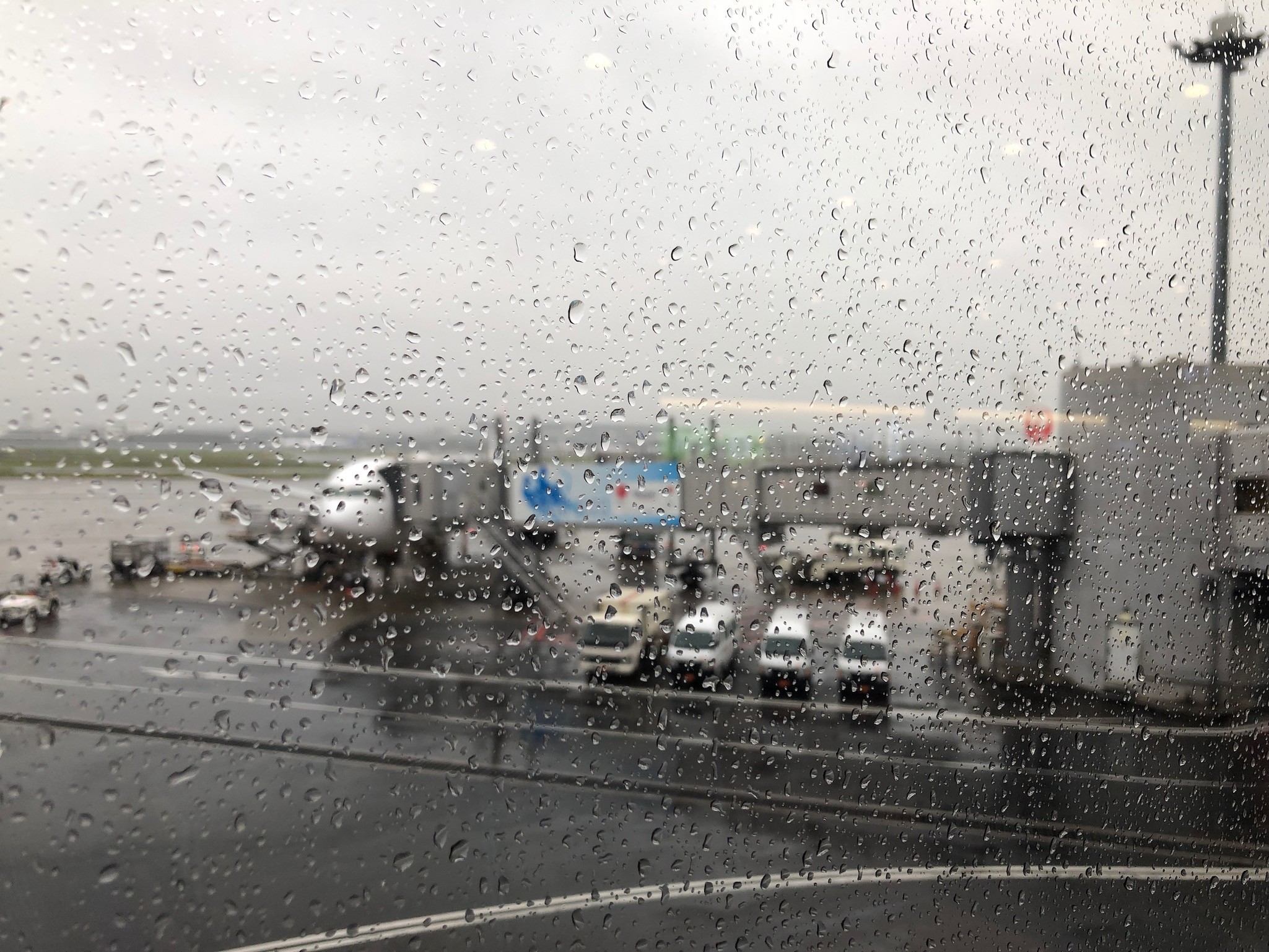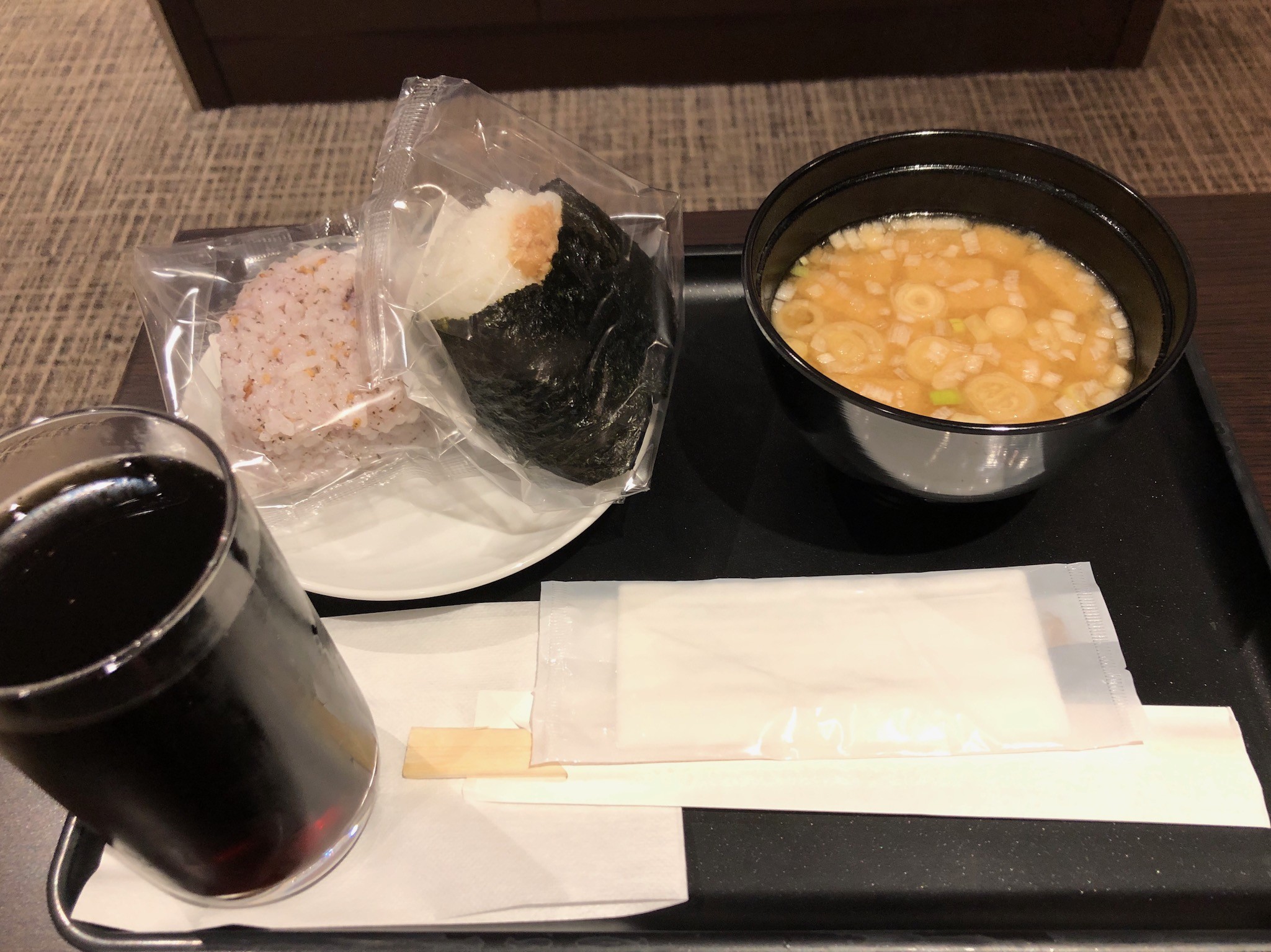 こっちは逆に少し水滴が入り込んでしまいました。今日はラウンジでいつものパンではなくて、おにぎりと味噌汁にしてみました。でもコーラも飲みたいので、かなりのミスマッチです。