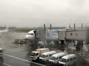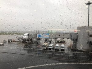 世間では神無月と言いますが、出雲地方では神在月と言います。八百万(やおよろず)の神が出雲大社に集まってくるので、出雲以外の日本の各地(昔はそれを全ての国という意味で全国と言った、現在では国全体の意味で使われている)では神様が不在になるのですが、出雲では神様であふれるわけでそう呼ばれます。ぜんざいの語源が神在(じんざい)とか、古代の出雲はどこでも不思議いっぱいです。タイトル画像はいつもの出雲行き朝一番のJL277便ですが、この日は生憎の雨模様、本格的に降ったせいで、実際には窓も水滴でいっぱいでした。