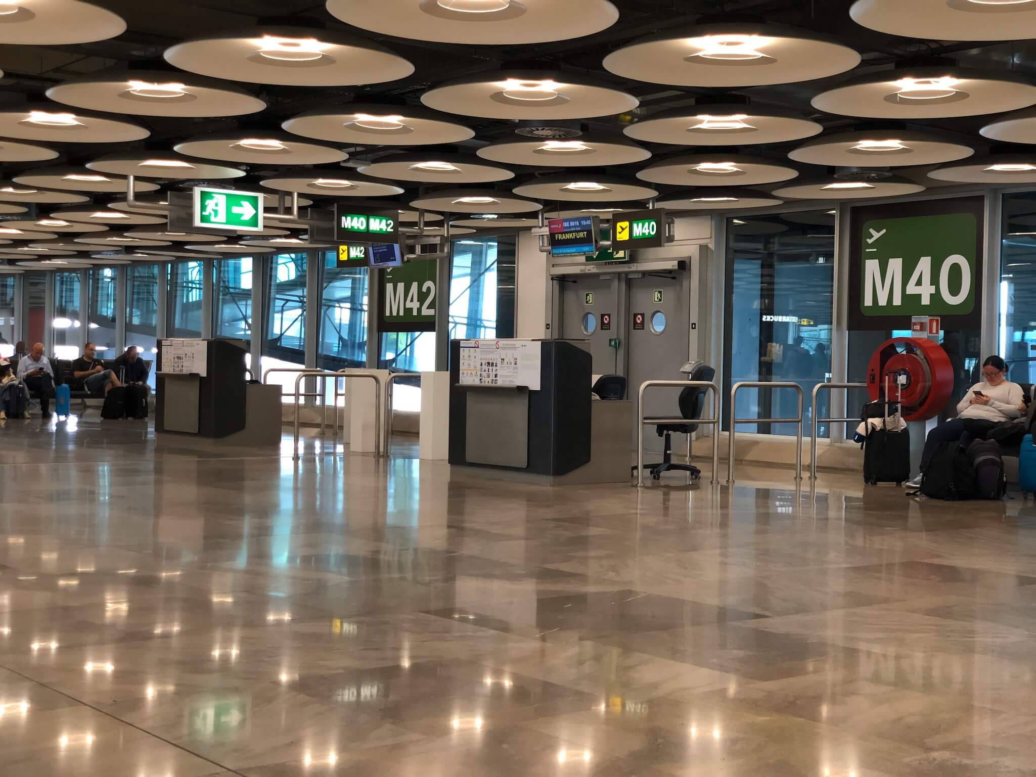 今回はターミナル4サテライトからの出発ですが、成田への直行便とは違い、出国スタンプはフランクフルトで押されるので、マドリッドでは出国審査の無いゲートMを利用します。