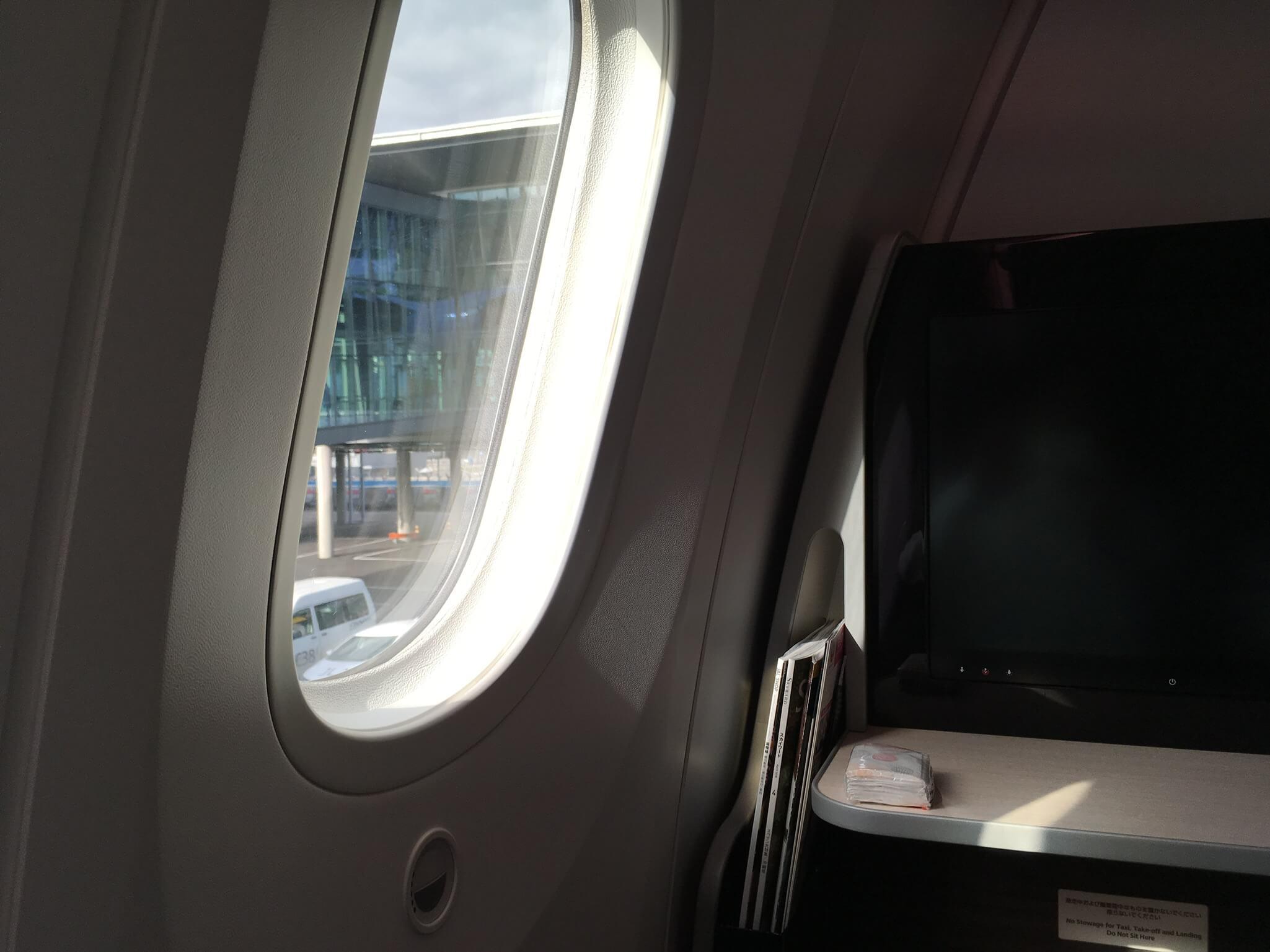 最近のマイブームである「窓側」最前列をゲット。隣とのパーティションを上げれば、プチ個室感覚で使えていい感じです。航空教室のCAさんのオススメも窓側席でした。